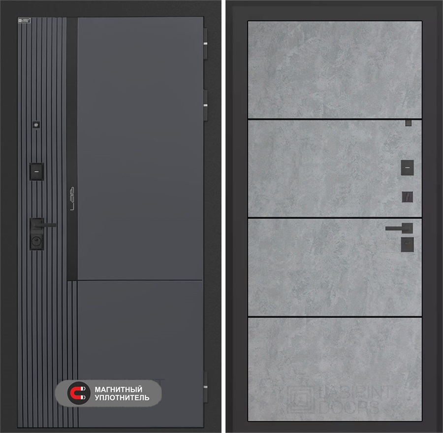 Входная дверь Лаб 2 Про - 25 Бетон светлый, черные молдинги для установки в квартиру