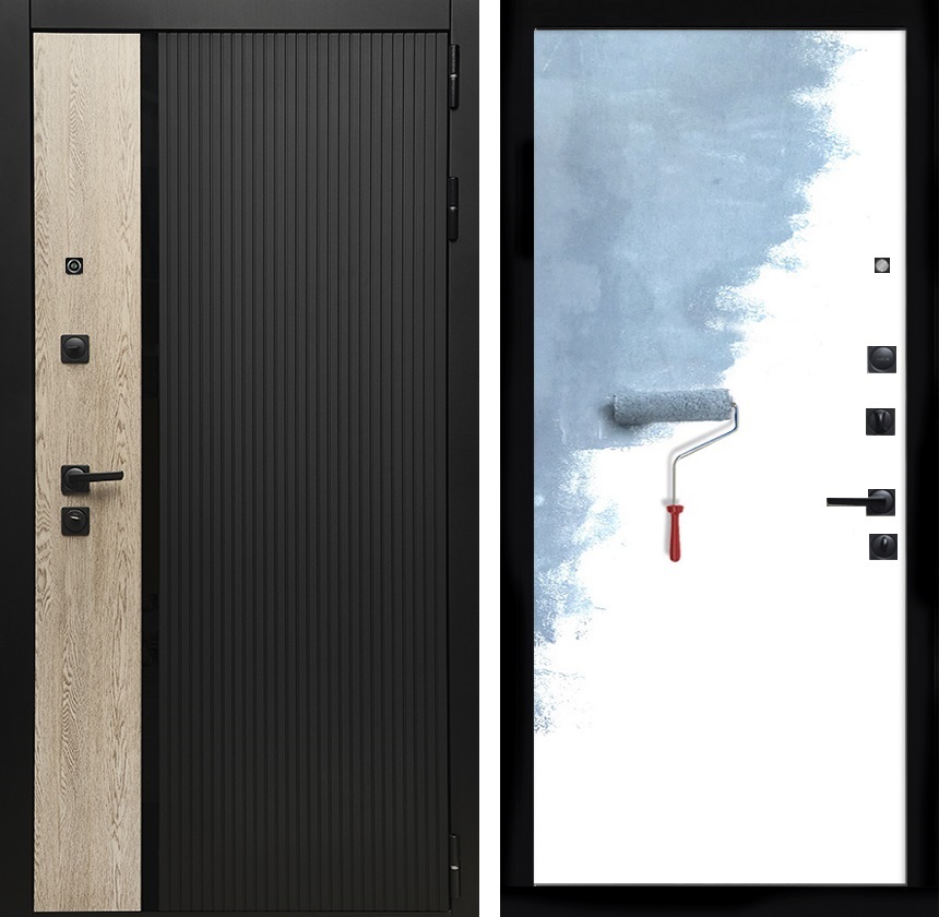 - 2 вариант отделки снаружи: декоративная МДФ панель 12 мм с антивандальной ПВХ пленкой без стеклянной черной вставки (минус 1000 руб от цены двери);